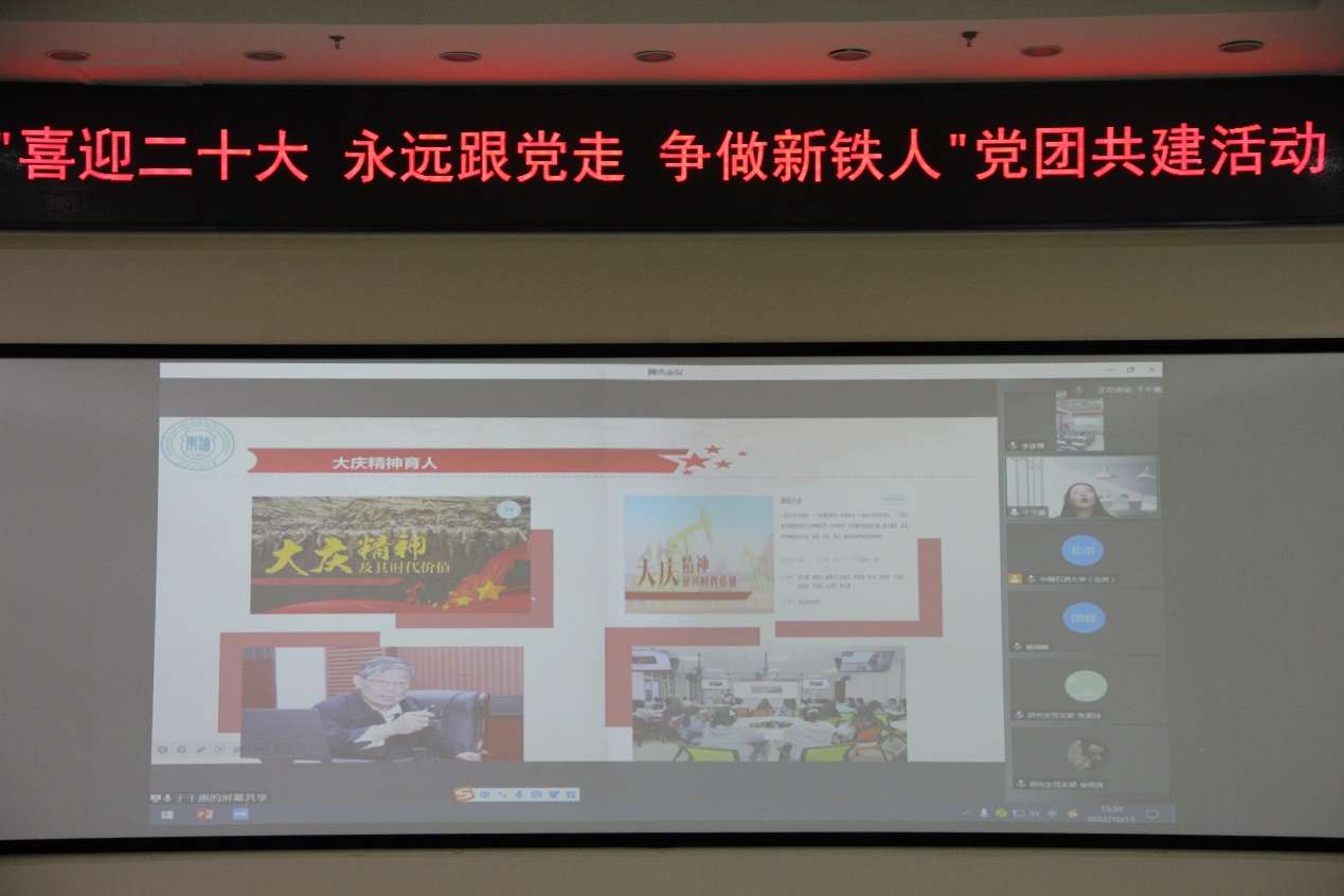 為迎接黨的二十大勝利,傳承大慶精神,弘揚鐵人精神,2022年10月13日下午,中國石油大學(北京)石油工程學院油氣田開發工程教工第一黨支部、提高采收率黨支部、石工本21-4團支部與東北石油大學外國語學院研究生黨支部聯合開展“喜迎二十大,永遠跟黨走,爭做新鐵人”黨團共建活動。東北石油大學外國語學院黨委書記楊國峰,中國石油大學(北京)石油工程學院黨委副書記劉東東、團委書記肖亞楠、油氣田開發工程第一黨支部書記趙曉亮、石工本21-4班班主任劉哲宇,相關黨支部黨員、團支部團員出席活動。