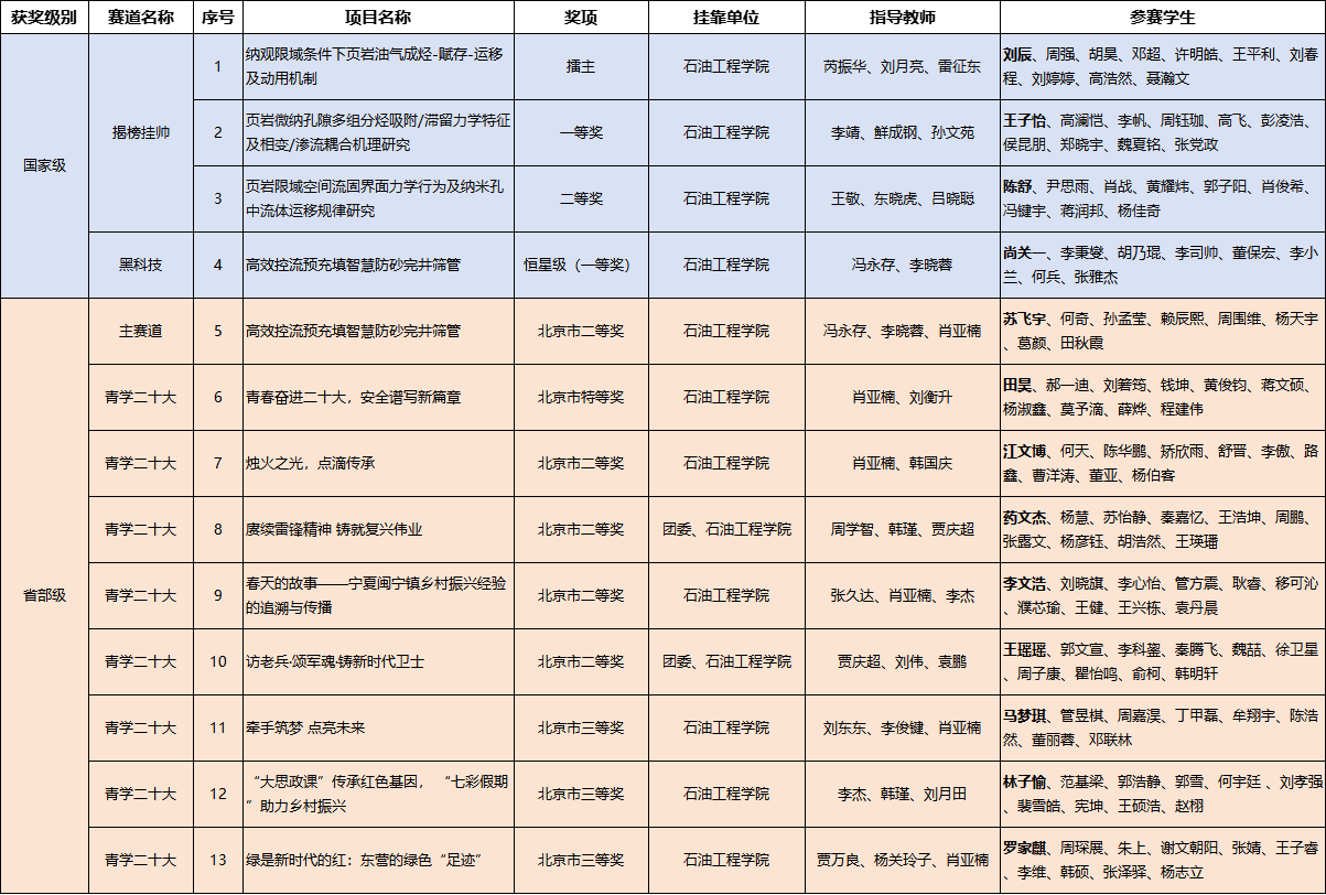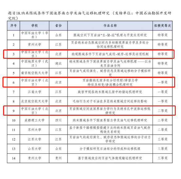 在 “揭榜掛帥”專(zhuān)項(xiàng)賽中獲得全國(guó)特等獎(jiǎng)1項(xiàng)(擂主)、全國(guó)一等獎(jiǎng)1項(xiàng)、全國(guó)二等獎(jiǎng)1項(xiàng),在賽題18——納米限域條件下固液界面力學(xué)及油氣運(yùn)移機(jī)理研究中獲得全國(guó)最好成績(jī)!