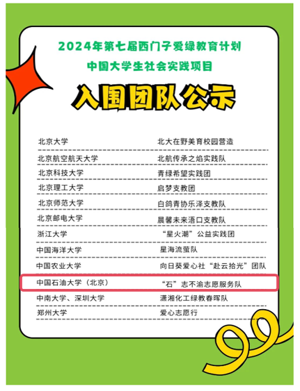 近日,由中國大學生知行促進計劃、西門子(中國)有限公司共同主辦的2024年第七屆西門子愛綠教育計劃——中國大學生社會實踐項目名單揭曉。學院“石”志不渝志愿宣傳團成功入選。