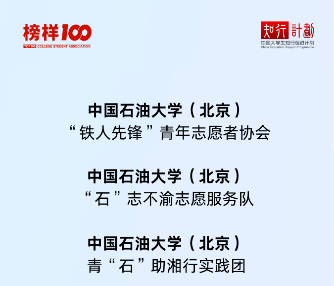 近日,由中國大學生知行促進計劃、青年影響力創(chuàng)新中心聯(lián)合開展的“榜樣100”全國優(yōu)秀大學生社團優(yōu)秀案例入選名單公布。學院“鐵人先鋒”青年志愿者協(xié)會、“石”志不渝志愿服務隊、青“石”助湘行實踐團三支團隊成功入選!