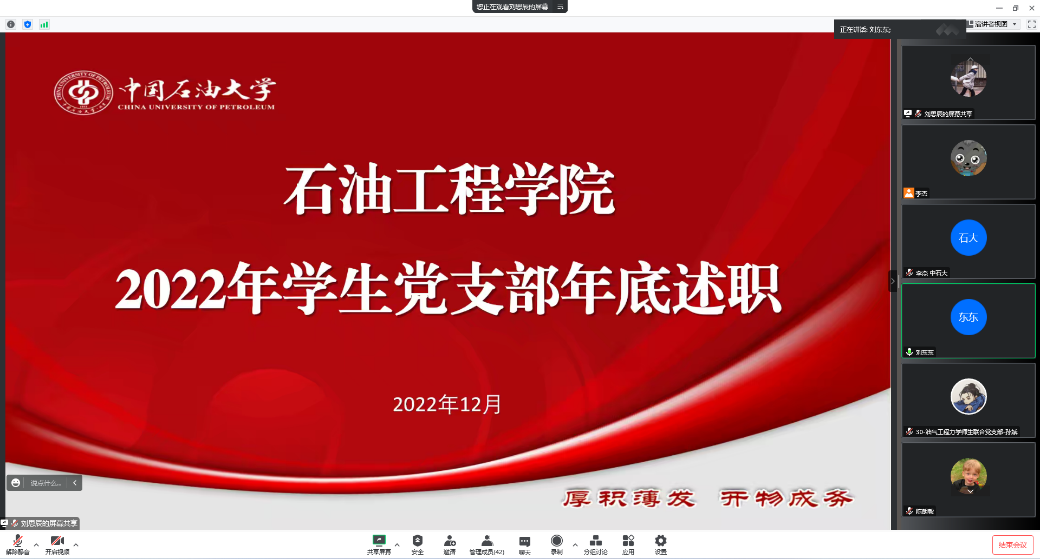12月19日下午,石油工程學(xué)院在線開展2022年學(xué)生黨支部述職評(píng)議會(huì)。黨委組織部郭佳老師、黨委宣傳部張國(guó)澤老師、黨委學(xué)生工作部祝寧老師,石油工程學(xué)院黨委副書記劉東東以及相關(guān)輔導(dǎo)員出席會(huì)議,學(xué)院全體學(xué)生黨支部書記參加了述職評(píng)議會(huì)。
