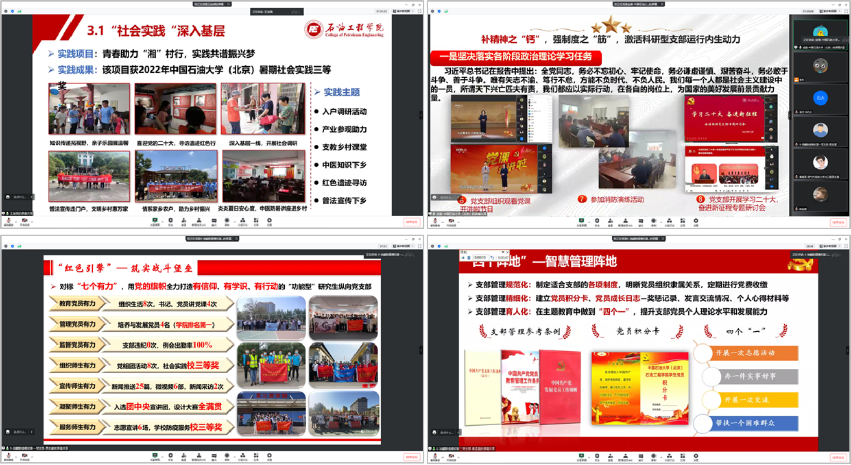 為實(shí)現(xiàn)高質(zhì)量黨建引領(lǐng)事業(yè)高質(zhì)量發(fā)展,石油工程學(xué)院依托課題組和實(shí)驗(yàn)室成立“功能型”黨支部,,順利完成研究生縱向黨支部?jī)?yōu)化重組。2022年,各支部緊扣迎接學(xué)習(xí)宣傳貫徹黨的二十大這條工作主線,積極開展了不同主題、豐富多彩的學(xué)習(xí)教育實(shí)踐活動(dòng),有效地激發(fā)了基層黨組織的活力,凝聚了黨員奮進(jìn)新征程的精神力量,持續(xù)推進(jìn)“黨建育人共同體”建設(shè),努力開創(chuàng)研究生黨建工作新局面。