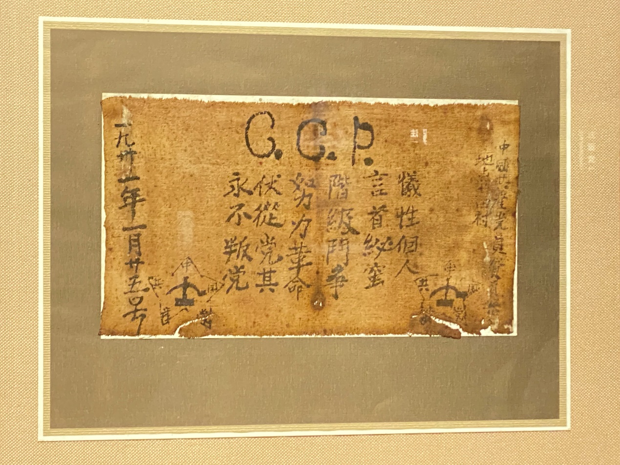 “革命理想高于天”。展館里有一幅泛黃的粗布,上寫著“C.C.P”和“犧牲個人”24字入黨誓詞,字跡不算工整,甚至還有錯別字,卻吸引了同學(xué)們駐足觀看。“這是迄今為止保留下來最早的中國共產(chǎn)黨人入黨誓詞。”講解員向同學(xué)們介紹,1931年1月25日,永新縣北田村農(nóng)民賀頁朵在自家榨油坊正式宣誓加入中國共產(chǎn)黨,他激動地將宣誓詞寫在一塊紅布上表達(dá)自己的決心。紅軍長征后,賀頁朵身負(fù)重傷,留在老家堅持斗爭,他將這塊寫有入黨誓詞的紅布用油紙包好,藏在榨油坊屋檐下。新中國成立后,這幅紅布被捐獻(xiàn)給文物部門。“它展示了農(nóng)民黨員對黨的熱愛之心和對革命的堅定信念。”