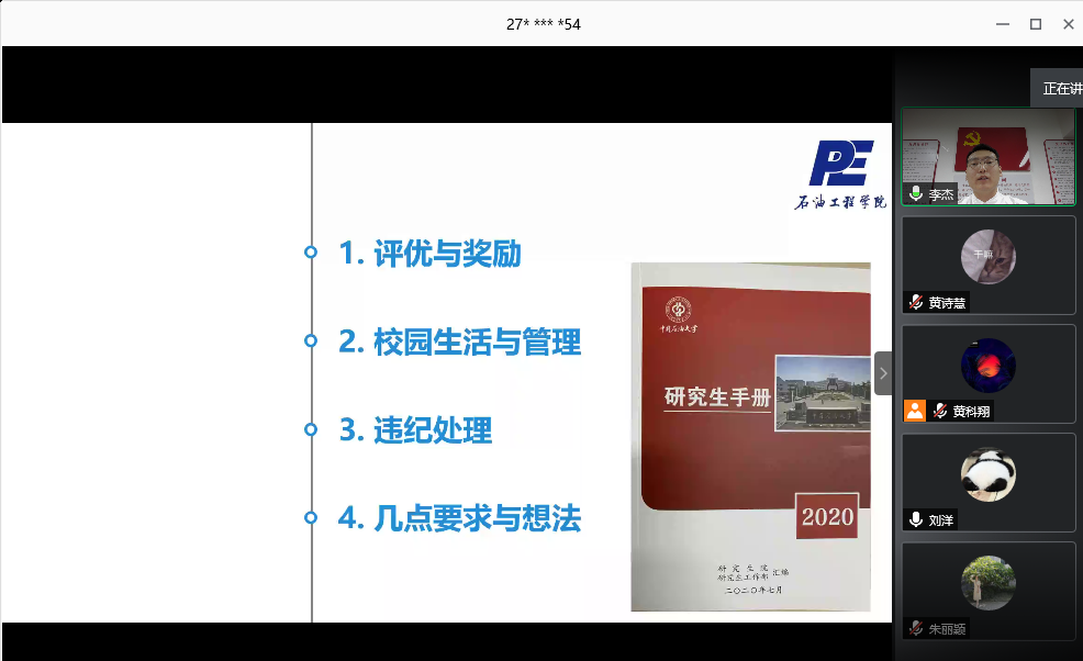 首先由2020級研究生輔導員李杰進行研究生手冊的宣講。李杰老師從評優與獎勵,校園生活與管理,宿舍違紀處理方法,飲食起居等各個方面介紹了與研究生生活息息相關的事情。