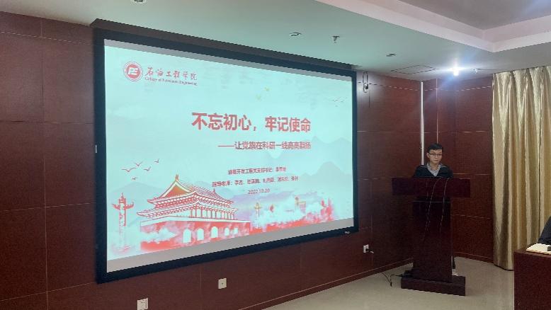 油藏開發工程黨支部書記裴雪皓以“不忘初心,牢記使命——讓黨旗在科研一線高高飄揚”為主題進行分享,以黨的二十大報告中對青年工作的要求出發,分別從思想引領、專業培養、實踐育人三個方面分享支部建設三位一體戰斗堡壘的經驗。隨后,與會人員積極發言討論并分享感悟。
