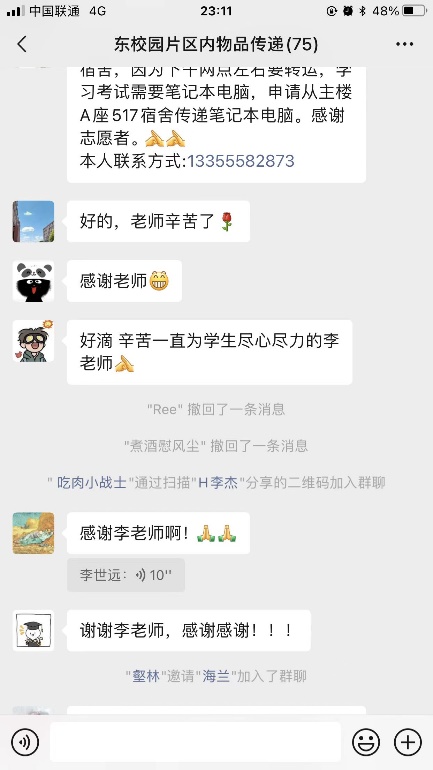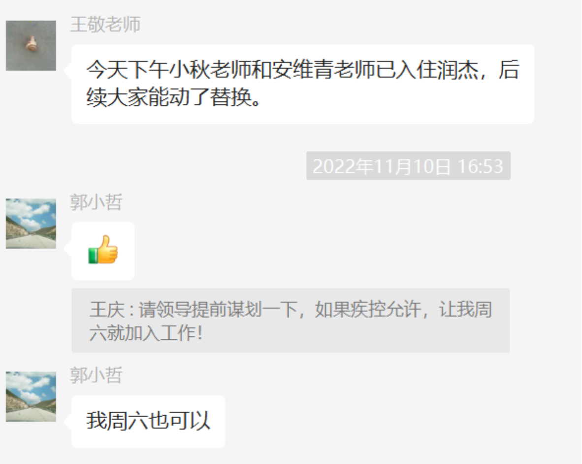 學生在哪里,老師就在哪里。宋執武老師進駐東校園參與服務保障工作。王小秋老師“丟”下“小家”中1歲多的小孩,義無反顧進駐潤杰公寓這個“大家”,陪伴守護本科生。協調運來1臺打印機,解決學生無法打印的難題。一位本科生突發腹痛尿結石,王老師克服困難第一時間將學生送到醫院治療,主動陪護、噓寒問暖,用心守護、用愛陪伴。
