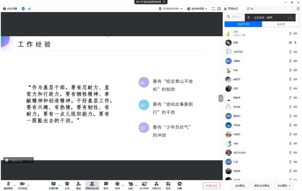 會上,姚舜對自己校園生活、考公準備及基層服務三個階段經歷進行了分享,并重點講述了自己公務員備考的成功經驗以及作為公職人員在基層為人民服務的難忘事跡。鼓勵大家要勇于面對學習生活工作中的各種挑戰和困難,堅定理想信念,保持專注,向著自己的既定目標奮勇前進。
