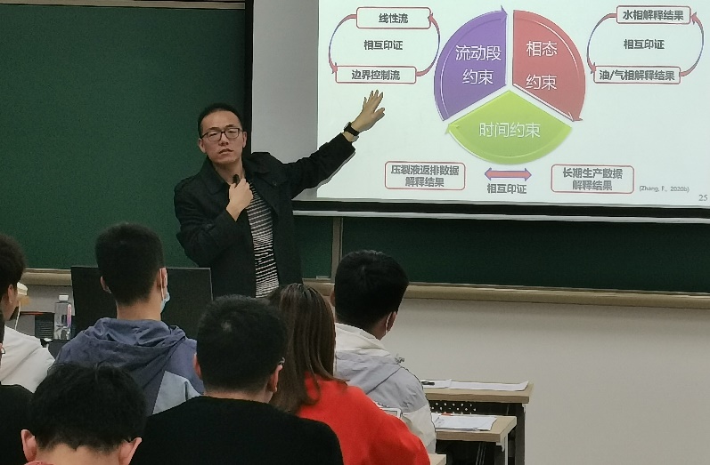 張鳳遠老師分享《基于多相排采數據的動態裂縫反演方法》方面的專業知識,還利用親身經歷,給同學們現身說法,分析國內與國外環境攻讀博士的利弊。