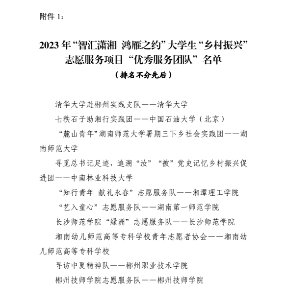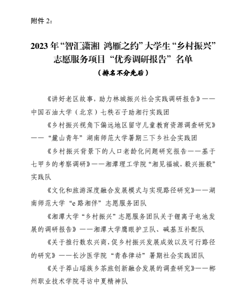 為深入學習貫徹習近平新時代中國特色社會主義思想,引導廣大青年學生在服務鄉村振興的生動實踐中受教育、長才干、作貢獻。2023 年 7 月至 8 月,共青團郴州市委開展了 2023年“智匯瀟湘 鴻雁之約”大學生“鄉村振興”志愿服務項目,共有省內外16所高校的27支實踐團隊報名參與。通過嚴格審核評議各團隊的實踐成果資料,最終確定了 2023 年“智匯瀟湘鴻雁之約”大學生“鄉村振興”志愿服務項目“優秀服務團隊”10 個、2023 年“智匯瀟湘 鴻雁之約”大學生“鄉村振興”志愿服務項目“優秀調研報告”7 個。