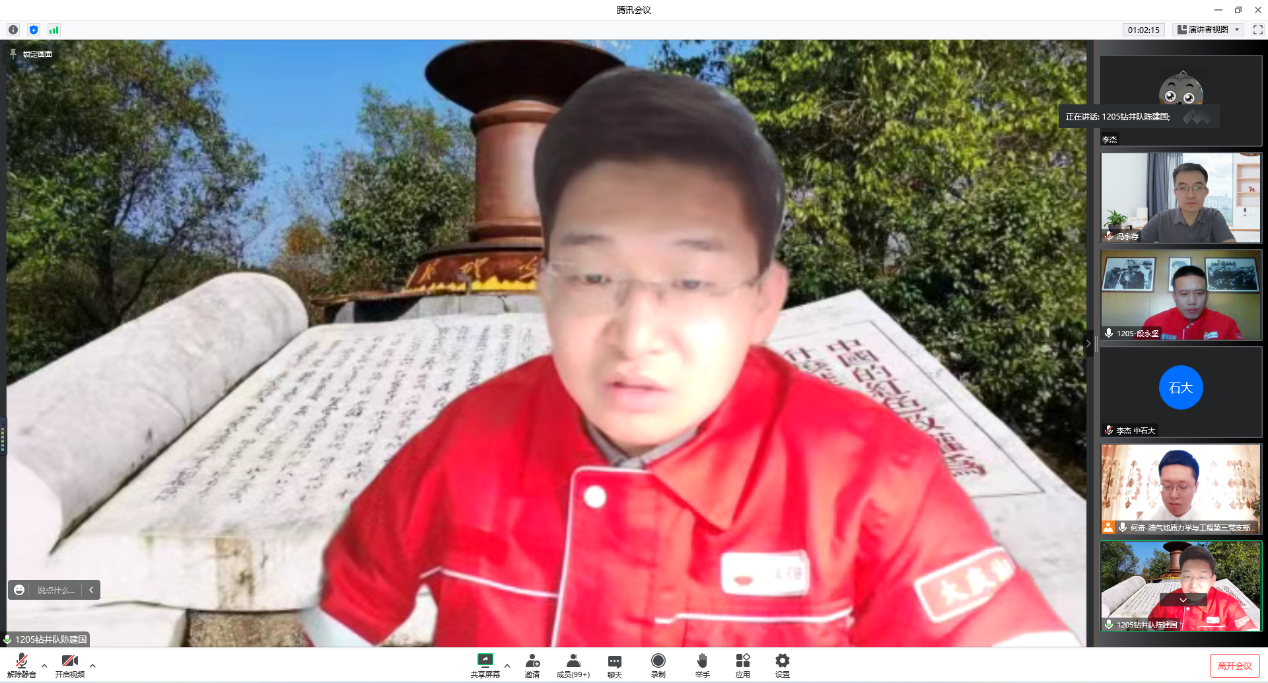 油氣地質力學與工程第三黨支部思想導師馮永存作總結講話,他首先對兩位校友線上回訪母校表示感謝。他表示鐵人精神是一種力量,在任何時代,任何地點都需要繼承與弘揚鐵人精神,希望能夠通過兩個黨支部的結對共建,以鐵人精神為核心,進一步推進“產”“學”“研”“用”深度融合,從而實現校企雙贏。