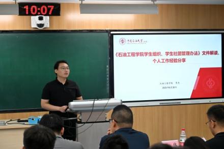在制度建設與經驗分享環節,輔導員李杰解讀《石油工程學院學生組織、學生社團管理辦法》,并圍繞“什么是一名好的學生干部”展開交流。他強調,優秀學生干部應具備“有信念、有責任、有能力、有目標”的綜合素質。