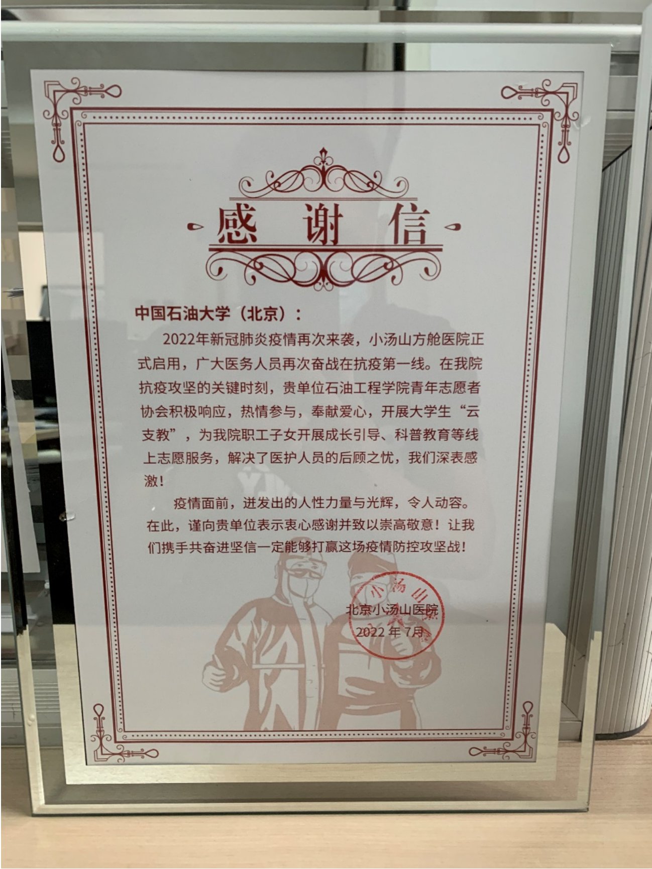 近日,北京小湯山醫院向中石大發來感謝信,對中石大石油工程學院青年志愿者協會在抗疫攻堅的關鍵時刻,組織志愿者為北京小湯山醫院職工子女開展成長引導、科普教育等線上志愿服務等表示感謝。