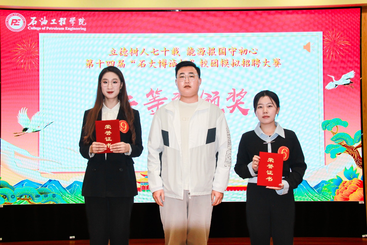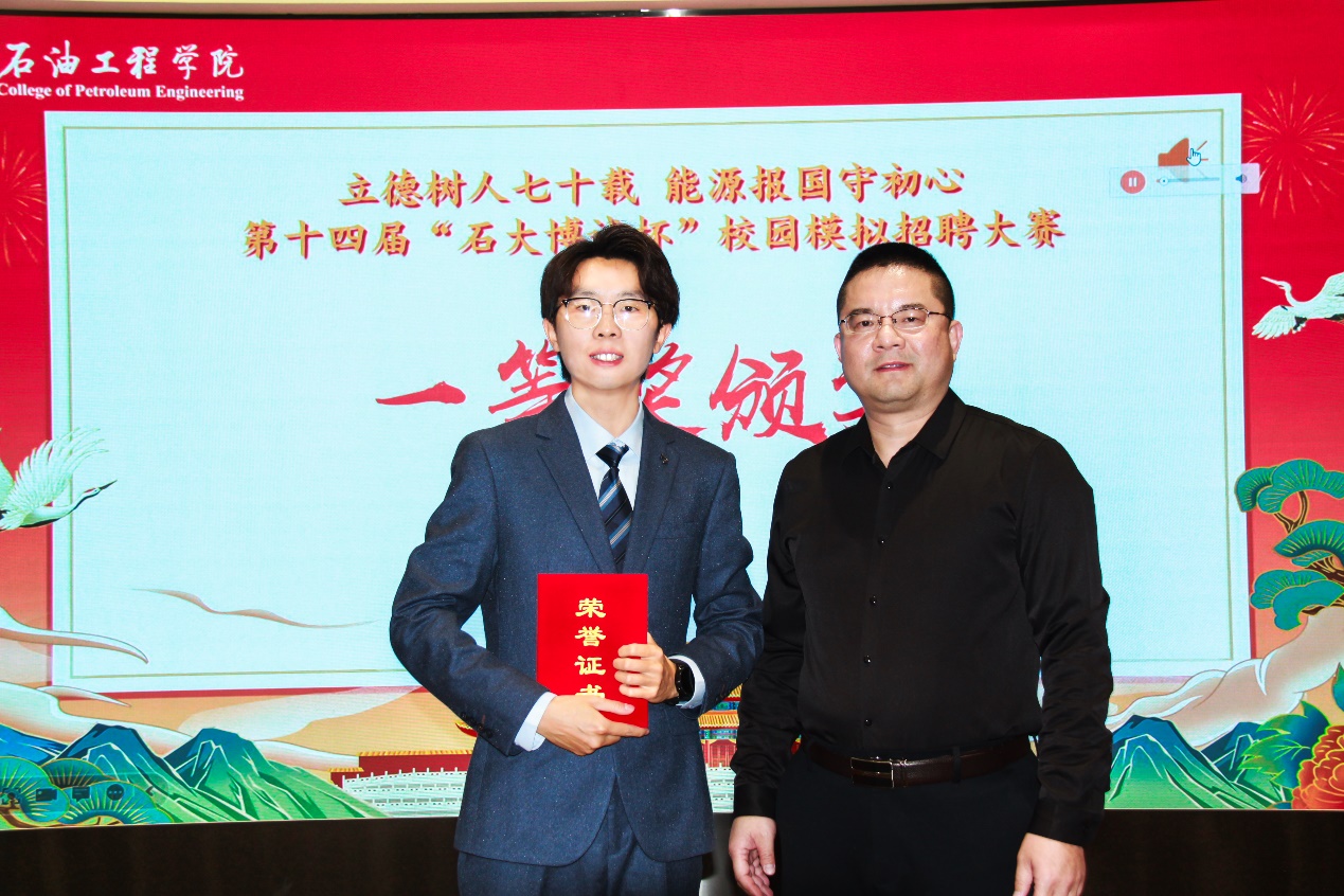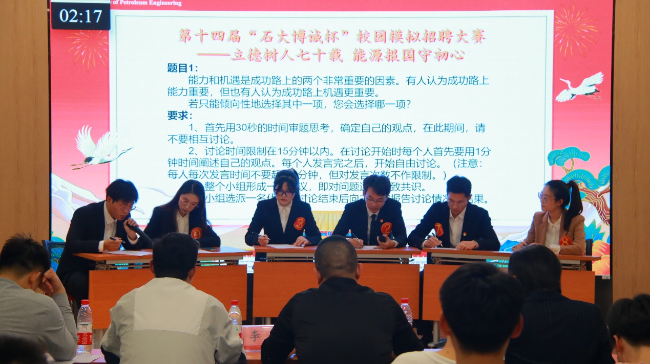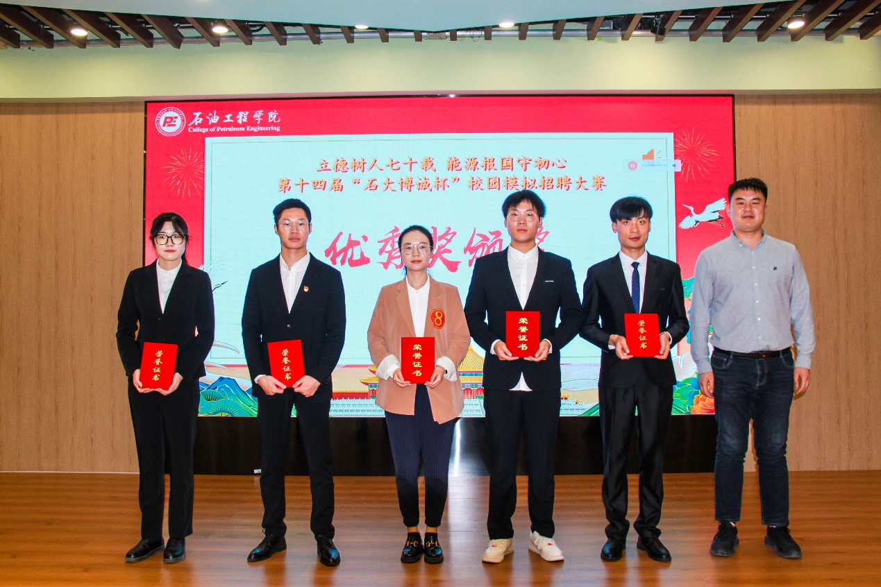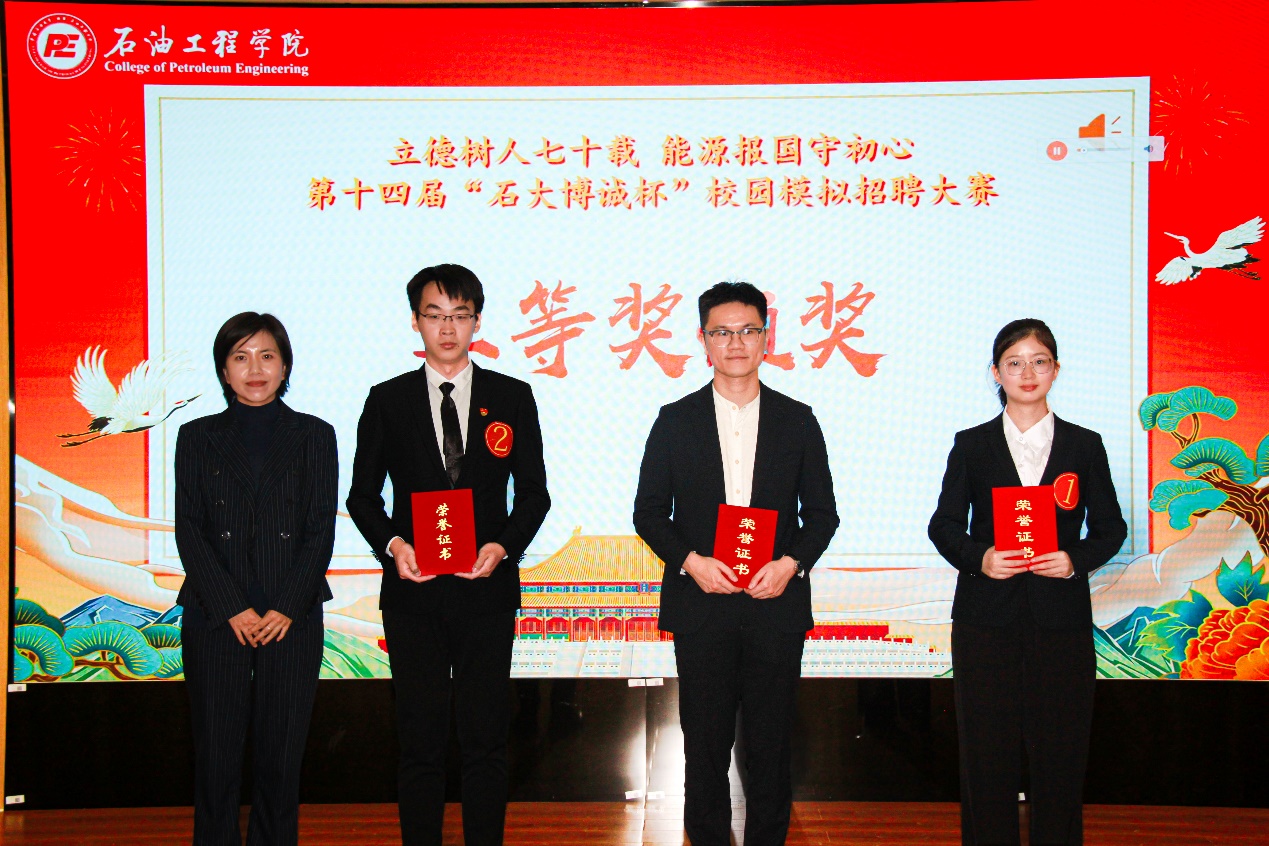 為落實學校關于開展“2024屆畢業生就業指導服務月”活動要求,幫助學生找準職業目標,感受真實求職場景,討論職場核心議題,搭建廣大學子從校園到職場溝通橋梁。由共青團中國石油大學(北京)石油工程學院委員會主辦、石油工程學院研究生會承辦的第十四屆"石大博誠杯"校園招聘模擬大賽決賽于10月14日在學生活動中心410舉行。本次大賽由北京石大博誠科技有限公司獨家贊助。北京石大博誠科技有限公司副總經理李磊、北京石大博誠科技有限公司實驗室主任王小東、千鋒互聯人力資源總監陳菲菲、石油工程學院團委書記肖亞楠、石油工程學院輔導員,第27屆研會指導老師劉衡升受邀參加本次決賽并擔任評委。