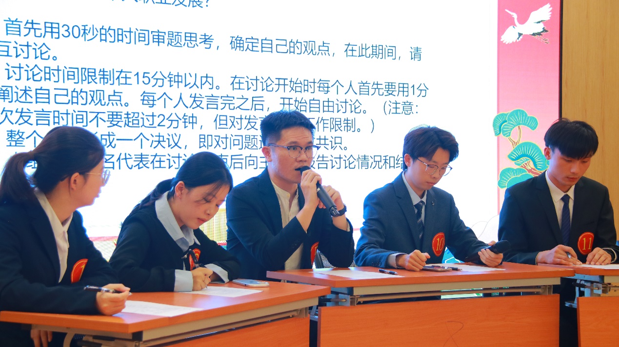 在"模擬群面"環節,比賽前進行隨機分組,11名來自不同學院的選手被分成兩個小組,以小組為單位進行無領導小組討論,時間為十五分鐘。現場為每個小組提供一個案例,由小組內部進行討論并最終得出結論進行匯報。圍繞案例,各小組進行了積極的討論,組內的每位成員都發表了自己的意見。兩小組各展風采、各顯千秋,均完成總結匯報,圓滿結束了討論。