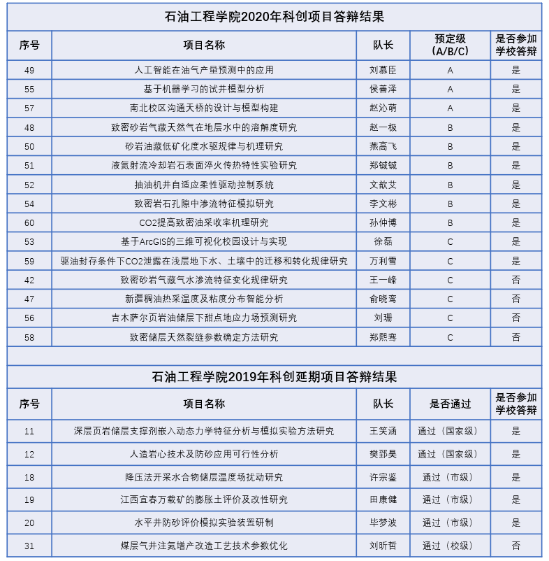 2021年5月13日下午15:30,石油工程學院2020年大學生創新創業訓練計劃結題答辯于中油大廈107會議室如期舉行。本次答辯邀請到學院馬新仿老師和李世遠老師擔任評審,共有20個項目團隊參與結題答辯。