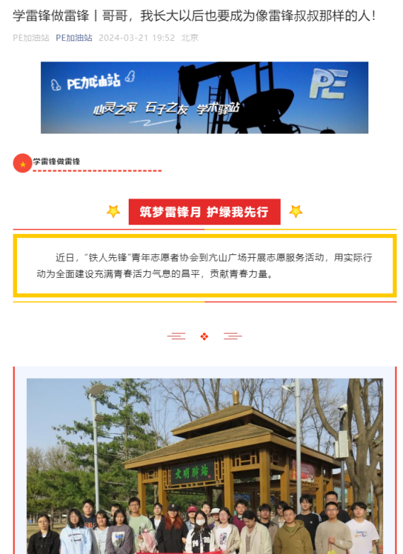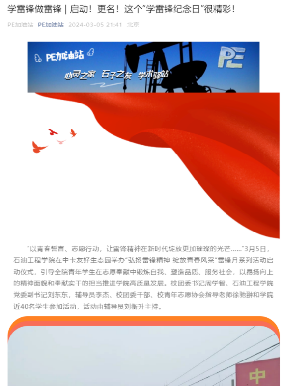 “啟動、宣講、觀影、支教、開辟專欄”豐富多彩的活動,掀起全院追“鋒”熱潮,引導廣大學生投身志愿服務,愛心奉獻社會。以“雷鋒紀念日”為契機,學院舉辦學習雷鋒月系列活動啟動儀式,邀請全國三八紅旗手李淑芳為學生講述帶領周邊婦女一起勤勞致富的故事,激發廣大學子愛崗敬業、奮勇爭先的工作熱情。組織志愿者通過猜燈謎、唱紅歌等喜聞樂見的形式打造“小小雷鋒課”,為昌平雪絨花社區孩子們的心里播下“雷鋒精神”的種子。采油采氣工藝黨支部、石工22-2團支部、石工22-1班等黨團班多形式觀看雷鋒事跡專題片、宣講新時代雷鋒故事,共同深刻領悟雷鋒精神的歷史意義與當代價值。學院開辟“學雷鋒做雷鋒”宣傳專欄,持續報道典型事跡、品牌活動等推文21篇,閱讀總量超8000人次,積極營造學院“人人學雷鋒,處處有雷鋒”良好氛圍。
