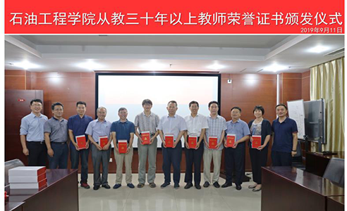 在第35個(gè)教師節(jié)來臨之際,北京市教育工會為從教三十年以上教師制作了紀(jì)念獎杯。根據(jù)校工會的部署安排,石油工程學(xué)院于2019年9月11日下午,舉辦從教三十年教師榮譽(yù)證書和紀(jì)念獎杯頒發(fā)儀式。頒發(fā)儀式由學(xué)院工會主席劉偉主持,分黨委書記寧正福、院長張廣清和從教三十年以上教師代表出席活動。