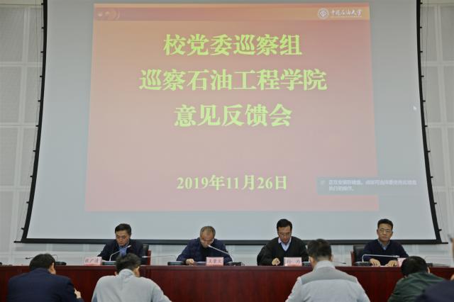2019年11月26日下午,校黨委巡察組巡察石油工程學院意見反饋會在主樓C308會議室召開,校黨委巡察組、巡察辦全體人員,石油工程學院黨政領導班子成員、師生代表、離退休教職工代表參加了反饋會,會議由石油工程學院院長張廣清主持。