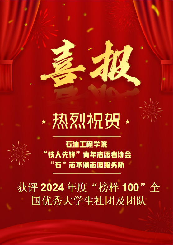 近日,中國大學生知行促進計劃、青年影響力創新中心聯合發布“榜樣100”全國優秀大學生社團及團隊公示。學院“鐵人先鋒”青年志愿者協會和“石”志不渝志愿服務隊成功入選!