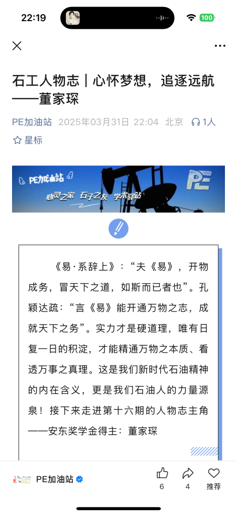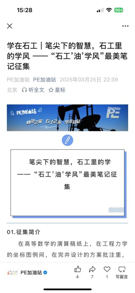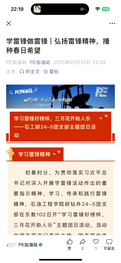 學院以宣講筑牢思想根基,用觀影踐行使命擔當,借“專欄開辟”營造濃厚氛圍,掀起全院追“鋒”熱潮,引導廣大青年學子在志愿服務中淬煉青春、奉獻社會。在“雷鋒紀念日”當天,發布“石小志”IP形象及志愿者服裝,通過視覺元素的創新,展現學院志愿者的風采。邀請全國三八紅旗手李淑芳為學生講述帶領周邊婦女一起勤勞致富的故事,激發廣大學子愛崗敬業、奮勇爭先的工作熱情。精心籌辦“百年征程杯”微團課大賽,12名團支書以真摯話語講述時代故事,以赤誠之心傳遞青年擔當。院研究生會、石工本24-1團支部創新“領學+研學+踐學”三維模式,以“理論研習筑牢信仰根基、熱點研討凝聚思想共識、實踐賦能彰顯青春擔當”為主線,組織開展全國兩會精神讀書班活動。水射流第三黨支部、研鉆井24-5團支部、石工本23-4班等黨團班多形式觀看雷鋒事跡專題片、宣講新時代雷鋒故事,共同深刻領悟雷鋒精神的歷史意義與當代價值。油藏工程黨支部、油氣井力學與控制工程第二黨支部、石工本23-1班赴中國石油勘探開發研究院參觀學習,深入了解我國石油勘探領域核心技術突破歷程與智能化轉型成果。學院開辟“學雷鋒做雷鋒”“我們的志愿故事”宣傳專欄,持續報道典型事跡、品牌活動等推文53篇,閱讀總量超15000人次,積極營造學院“人人學雷鋒,處處有雷鋒”良好氛圍。