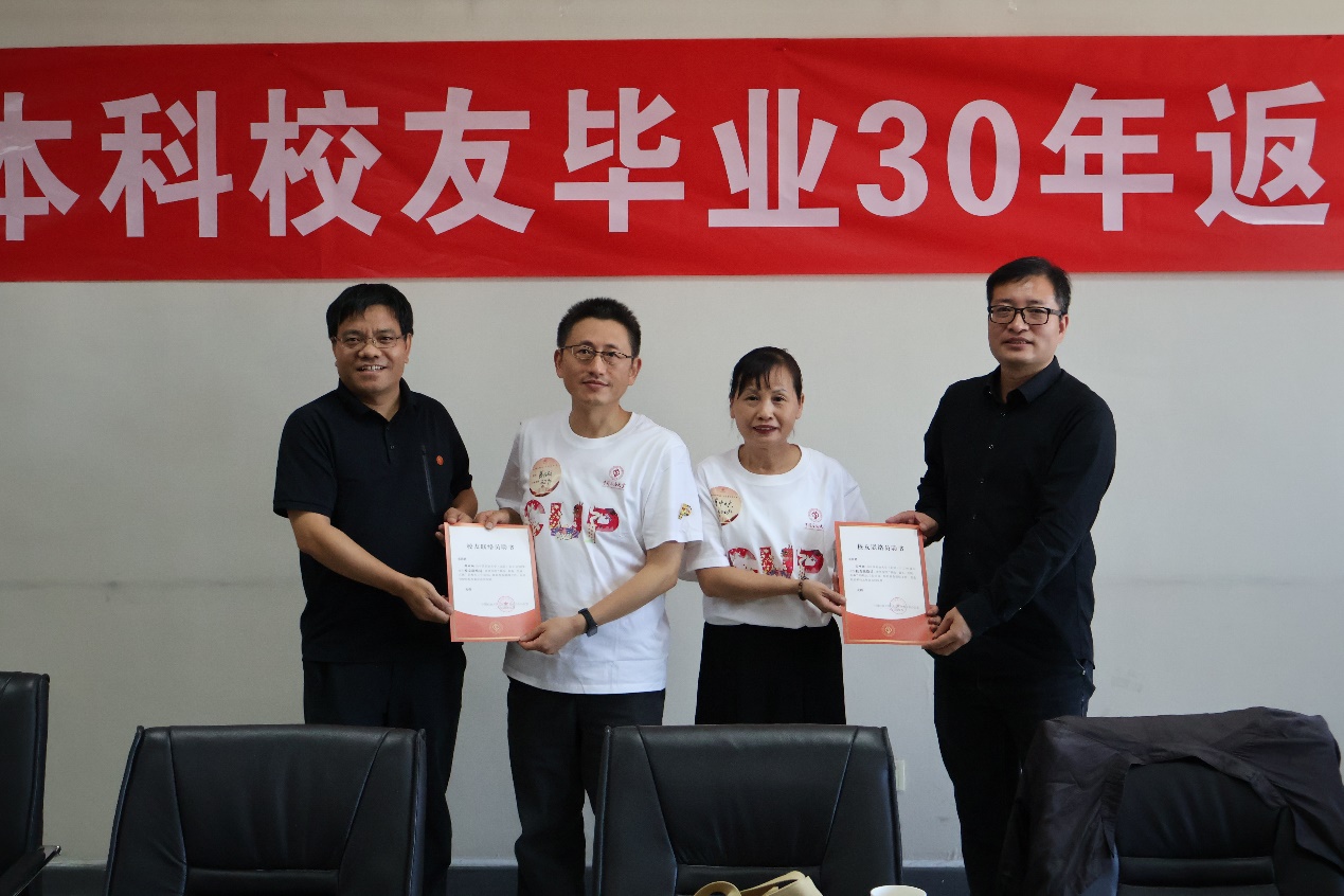 學院舉行校友聯絡員聘任儀式,黃世軍、宋先知為鮮成鋼、肖中瓊頒發校友聯絡員聘書。