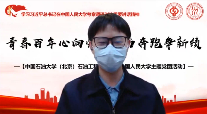 為深入學習習近平總書記在中國人民大學考察調研時發表的重要講話精神,4月30日晚,中石大石油工程學院油藏數值模擬第二黨支部、本石工20-6團支部與中國人民大學“延河講師團”聯合開展“青春百年心向黨,奮力奔跑爭新績”主題黨團活動。本次活動以線上線下結合的形式舉辦,中國人民大學“延河講師團”成員代表,中國石油大學(北京)學生工作處副處長孫凈宇,石油工程學院團委書記肖亞楠,輔導員代表以及黨團支部成員參加本次活動。