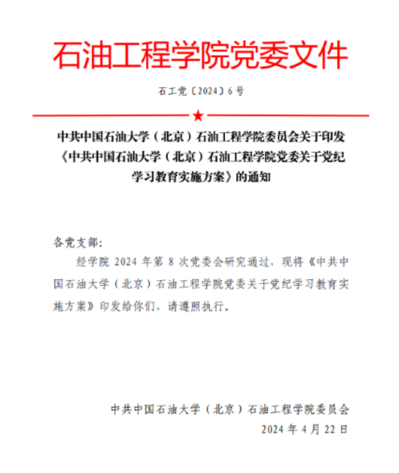 為深入學習貫徹習近平總書記關于黨紀學習教育的重要講話和重要指示精神,認真學習新修訂的《中國共產黨紀律處分條例》,中石大石油工程學院統籌規劃,一體推進,多模式、多層次開展黨紀學習教育系列活動,切實推動黨紀學習教育落地見效、走深走實。