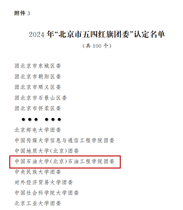 近日,共青團北京市委員會揭曉了2024年“北京市優(yōu)秀共青團員、優(yōu)秀共青團干部、五四紅旗團委(團支部)、優(yōu)秀少先隊員、優(yōu)秀少先隊輔導員、優(yōu)秀少先隊集體”的認定結(jié)果,中石大石油工程學院團委榮獲“北京市五四紅旗團委”榮譽稱號。該稱號是共青團北京市委員會授予基層團組織的最高榮譽,全市共有100個單位入選,其中高校學院團委2個。