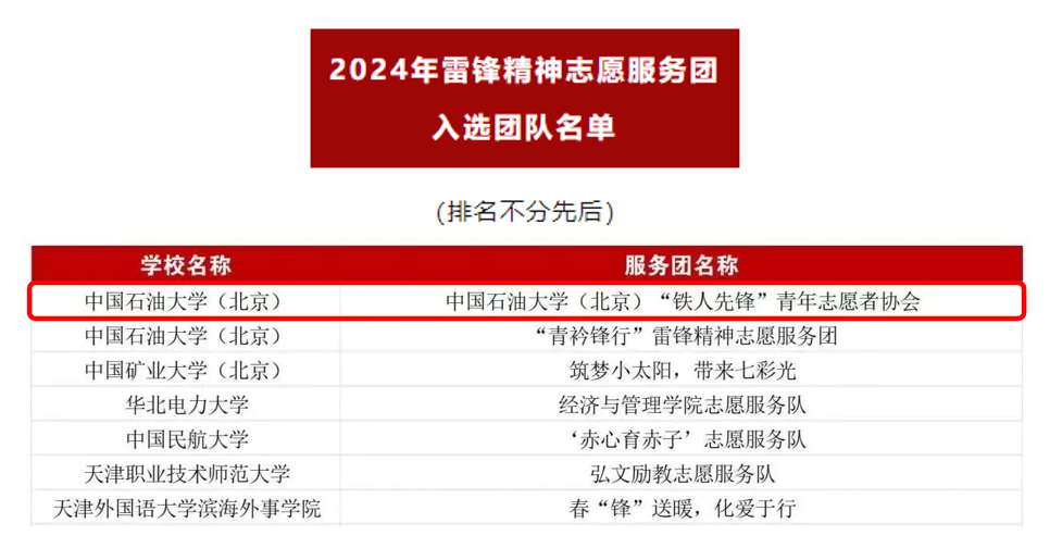 本次活動得到了各高校志愿服務團隊的廣泛關注和積極參與。主辦單位對所有申報材料進行了認真審閱,最終遴選出來自中國石油大學(北京)、南京大學、鄭州大學、華北電力大學等206所高校的240支大學生志愿服務團隊。中國石油大學(北京)“鐵人先鋒”青年志愿者協會成功入選!