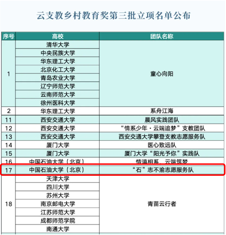 近日,中國大學(xué)生知行促進(jìn)計(jì)劃、有愛有未來企業(yè)志愿行動(dòng)、青年影響力創(chuàng)新中心、校園行動(dòng)派聯(lián)合公布了第六屆全國云支教鄉(xiāng)村教育獎(jiǎng)第三批立項(xiàng)團(tuán)隊(duì),中國石油大學(xué)(北京)“石”志不渝志愿服務(wù)隊(duì)成功入選。