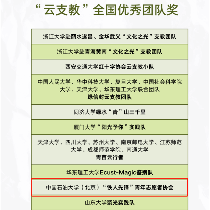 近日,由中國知行計劃持續響應國家“鄉村振興”政策號召和團中央“美麗中國·青春行動”倡導所開展的“美麗中國·青春行動”第六屆云支教鄉村教育獎成果公布,石油工程學院“石”志不渝志愿服務隊獲評“云支教”全國最佳團隊(全國5支),“鐵人先鋒”青年志愿者協會獲評“云支教”全國優秀團隊(全國35支)。
