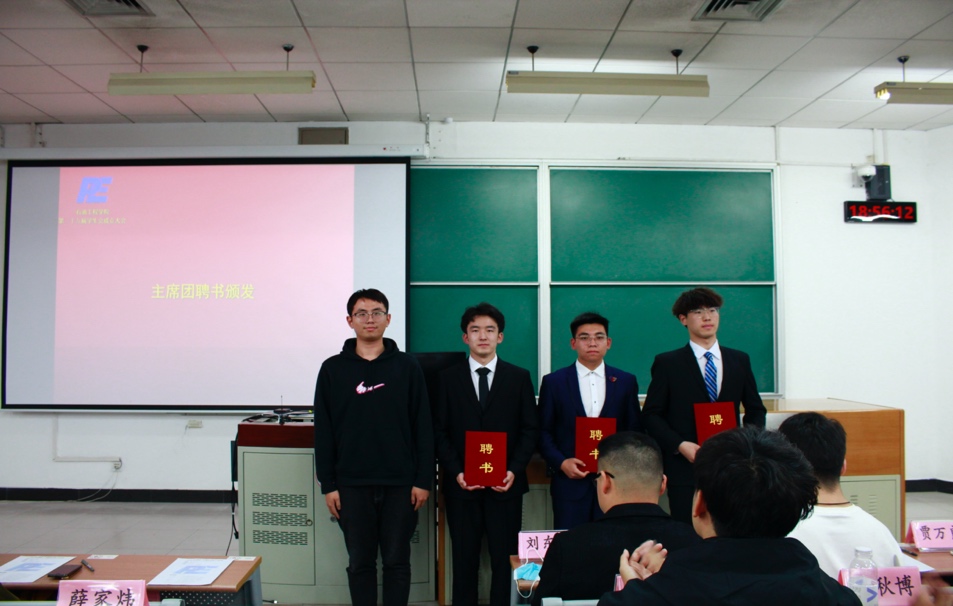 緊接著是聘書頒發環節,指導老師賈萬良為主席團頒發聘書。