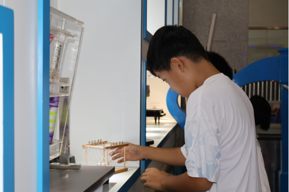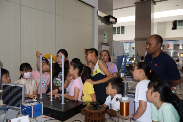 在“石油之光”全國科普基地,志愿者帶領(lǐng)學生參觀了錐體上滾儀器,伯努利原理演示儀,神舟號太陽能模型,手摸發(fā)電儀等設(shè)備,引導學生親自動手嘗試了共振原理演示,高壓靜電演示和光學實驗等一系列物理實驗。