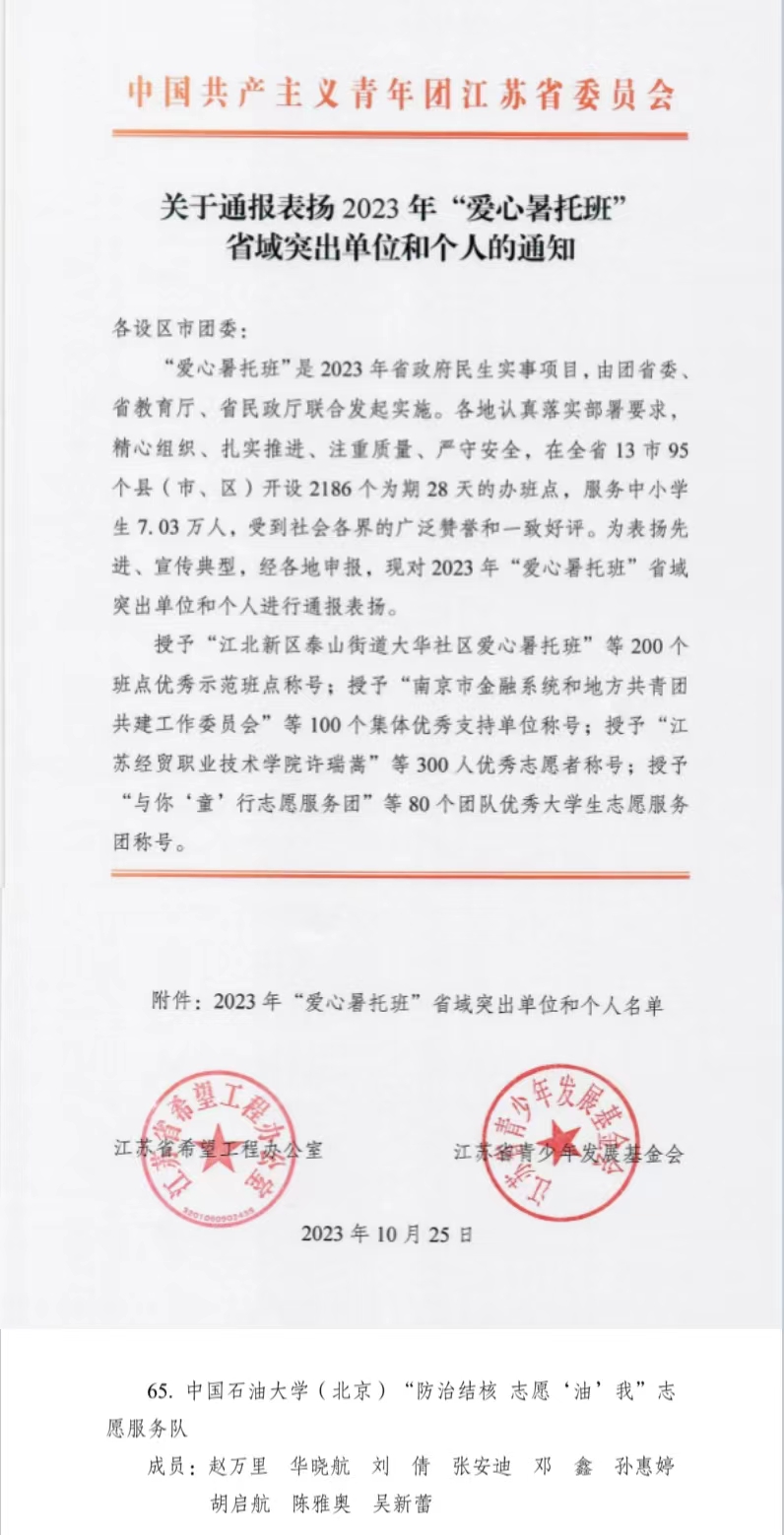 近日,團江蘇省委公布2023年“愛心暑托班”省域突出單位和個人,中國石油大學(北京)“防治結核 志愿‘油’我”志愿服務隊獲評優秀大學生志愿服務團稱號。