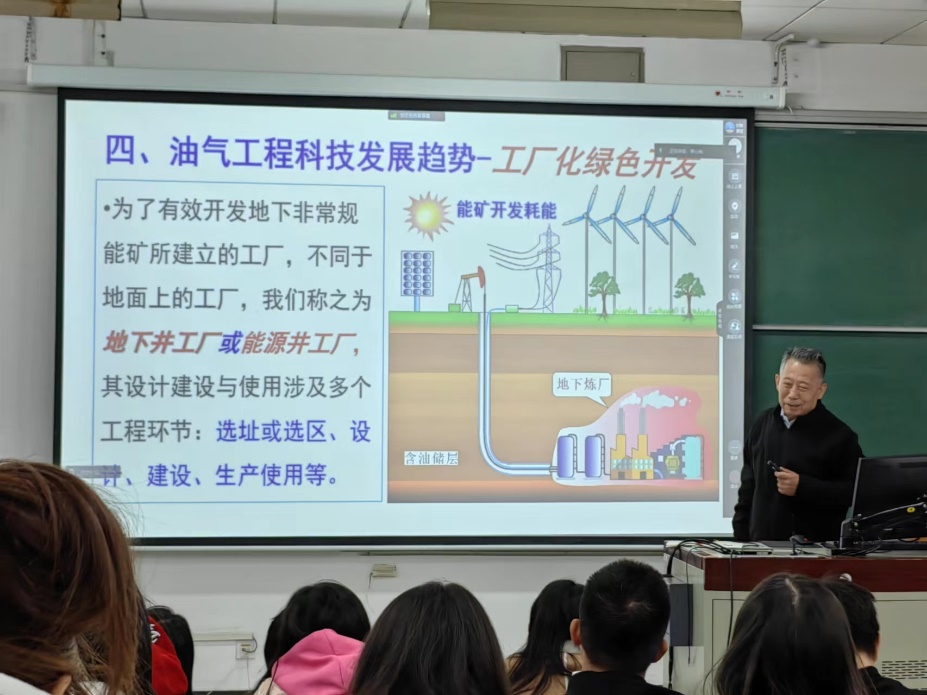 常言道上天難,入地更難。高老師以“石油工程學科特點與科技創新”為主題,用生動的語言向學生們介紹了石油工程專業及學科特點,強調能源是地球資源的重要組成部分,需要合理開發,讓同學們了解節能提效的重要性;結合動畫展示了油氣田開發井型技術的進步,分析當前煤層氣開發、煤炭地下氣化、定向鉆井工程、大位移定向鉆叢式水平井工程等技術現狀,讓大家感受到油氣行業頂尖人才對行業的熱愛和對未知的探索精神;針對當前油氣工程科技發展趨勢,指出目前需要加大油氣資源勘探開發和增儲上產力度,確保能源安全,勉勵同學們端牢能源飯碗,在能源轉型的背景下為綠色低碳智能化開發做出貢獻。