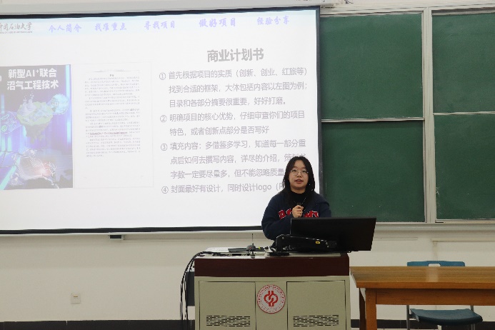 化學(xué)工程與環(huán)境學(xué)院2023級博士研究生邵凡、新能源與材料學(xué)院2021級本科生張?zhí)锘邸⒎浅R?guī)油氣科學(xué)技術(shù)研究院2021級研究生王瑋圍繞賽前報(bào)名、項(xiàng)目選題、如何組隊(duì)、商業(yè)計(jì)劃書撰寫、PPT制作、路演匯報(bào)等方面分別做分享。