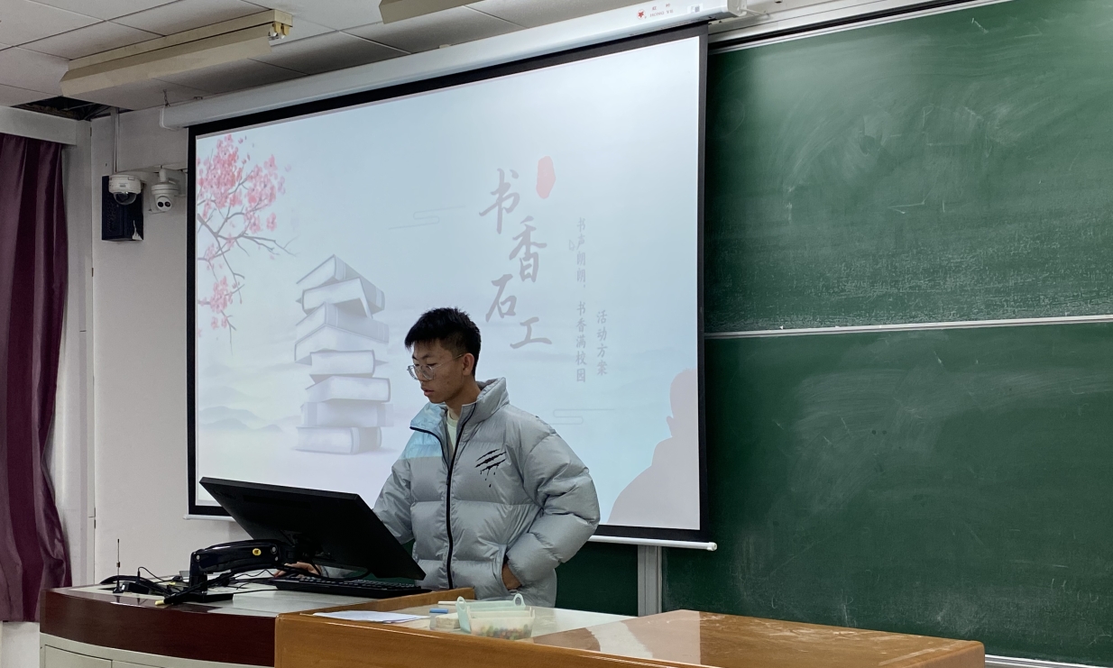 主持人介紹此次活動的背景與目標,并向同學們展示“書香石工”活動的往年成果。而后,主持人重點講述活動安排:由“研討交流”、“讀書分享”、“六類閱讀”、“量化考核”四個方面組成。