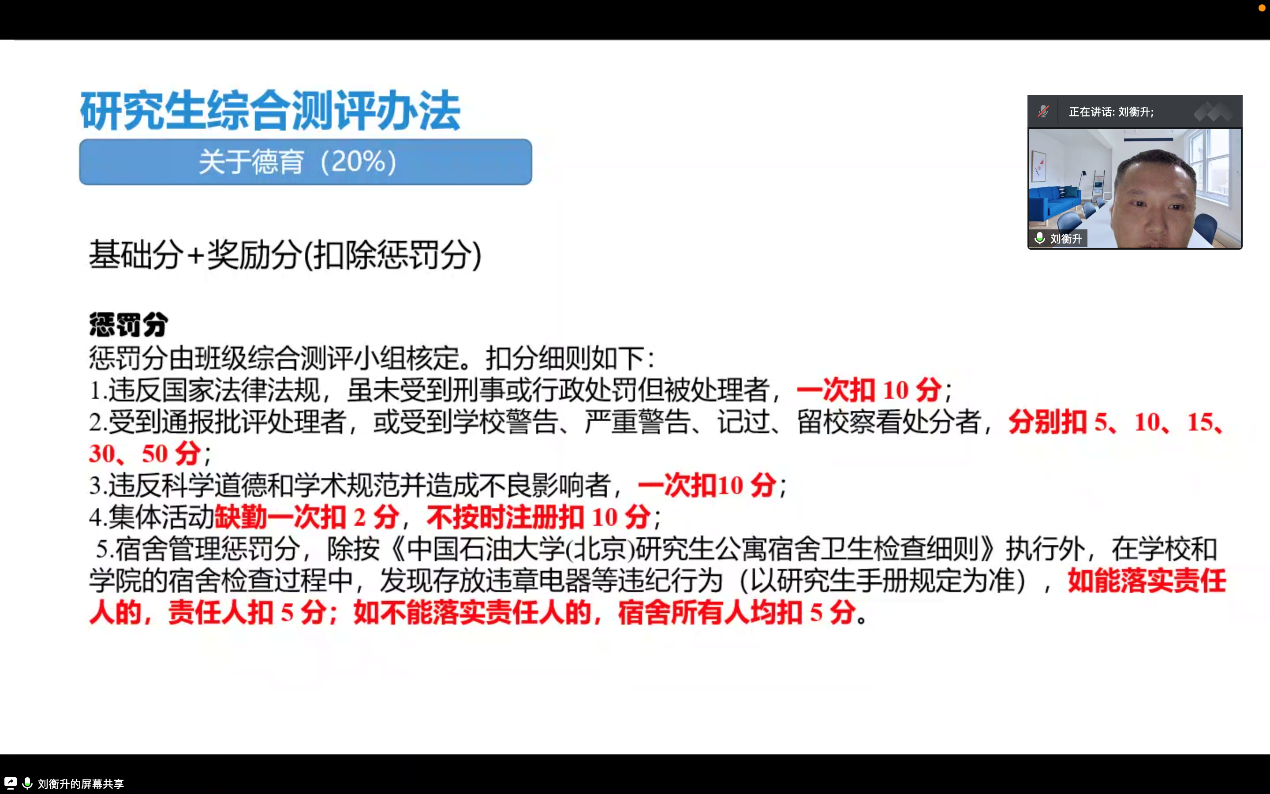 為進一步幫助研究生新生堅定理想信念,厚植愛校情懷,適應角色轉變,提升研究能力,提高研究生新生科學道德素養。8月24日至25日,石油工程學院通過線上形式舉辦2022級研究生入學教育暨研究生手冊宣講會。石油工程學院副院長劉偉、黨委副書記劉東東、全英文國際碩士班班主任楊睿月、2022級研究生輔導員劉衡升、劉思辰出席會議。本次大會由劉衡升主持。