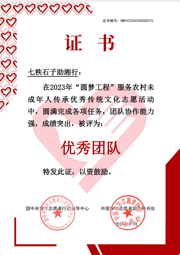 近日,中央文明辦三局、團(tuán)中央青年志愿者行動(dòng)指導(dǎo)中心、中國(guó)青年志愿者協(xié)會(huì)秘書(shū)處共同主辦的2023年“圓夢(mèng)工程”服務(wù)農(nóng)村未成年人傳承優(yōu)秀傳統(tǒng)文化志愿服務(wù)優(yōu)秀團(tuán)隊(duì)名單揭曉。學(xué)院“七秩石子助湘行”實(shí)踐團(tuán)成功獲評(píng)。