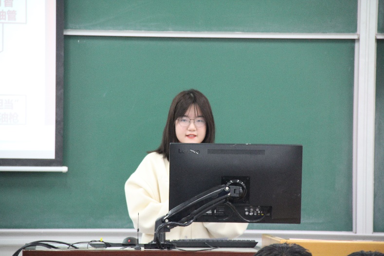 石工本20-6團支部書記張婧分享了打造“PE加油站”特色團支部的經驗,構建思想引領“儲油罐”儲滿信念之油;鏈接學風引領“輸油管”輸穩才智之油;打造實踐引領“加油機”,供足擔當之油,高舉特色引領“加油槍”,加準綠色之油,以這四個方面為思路進行優秀團支部建設。
