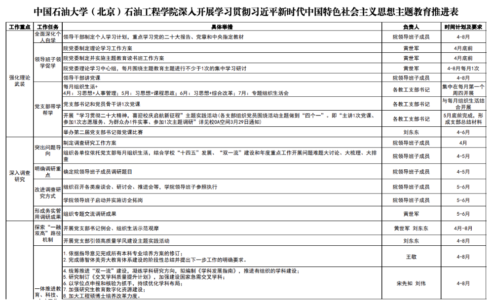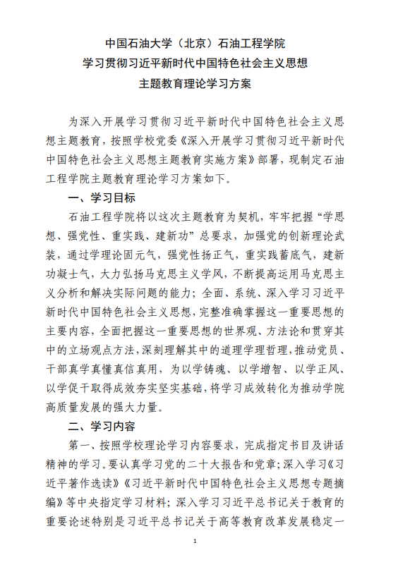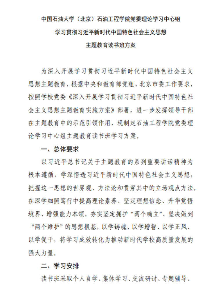 學校黨委牢牢把握主題主線,第一時間成立領導小組、制定實施方案,加強對主題教育的頂層設計。學院成立以學院黨委書記為組長、領導班子成員任副組長的領導小組,加強組織領導,形成齊抓共管合力,為主題教育各項任務扎實推進提供堅強有力的組織保障。學院對標對表主題教育工作要求,制定《石油工程學院學習貫徹習近平新時代中國特色社會主義思想主題教育理論學習方案》《石油工程學院黨委理論學習中心組主題教育讀書班學習方案》,對學院主題教育一體謀劃、一體部署,并制定施工圖和推進表,堅持對單落實、掛圖作戰,確保主題教育扎實推進。
