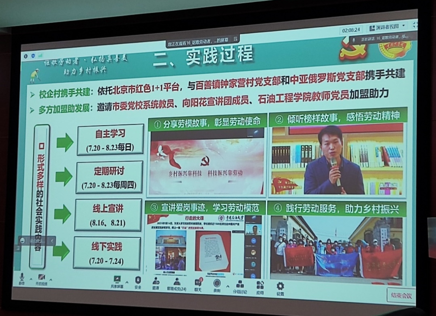 為深入總結(jié)經(jīng)驗(yàn),樹(shù)立典型,總結(jié)鞏固社會(huì)實(shí)踐活動(dòng)成果,選拔優(yōu)秀實(shí)踐團(tuán)隊(duì),8月25日,石油工程學(xué)院召開(kāi)2022年暑期社會(huì)實(shí)踐結(jié)題評(píng)優(yōu)答辯會(huì),本次會(huì)議邀請(qǐng)了北京市教工委宣傳教育處干部王宇航,北京團(tuán)市委大學(xué)中專工作部干部苗天,中國(guó)石油大學(xué)(北京)經(jīng)濟(jì)管理學(xué)院教師鄧秀煥,馬克思主義學(xué)院副教授楊關(guān)玲子,校團(tuán)委學(xué)術(shù)科技實(shí)踐部部長(zhǎng)賈慶超擔(dān)任專家評(píng)委,石油工程學(xué)院黨委副書(shū)記劉東東、團(tuán)委書(shū)記肖亞楠出席會(huì)議,會(huì)議由輔導(dǎo)員劉衡升主持。