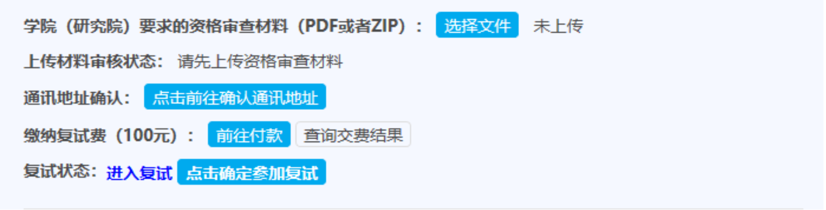 所有進入復試的考生均須在學院規定的時間內,通過我校研究生招生管理信息系統(http://gmss.cup.edu.cn/logon)選擇“碩士研究生復試錄取”欄目完成“復試確認(資格審查材料上傳、繳費)”、“意向導師選擇”。