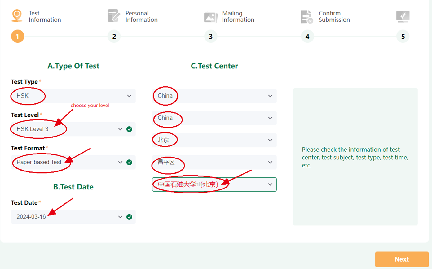 Note:According to your own needs, test format choose "paper -based test" or "Internet-based test(at centre)",and the test site must be China University of Petroleum (Beijing)