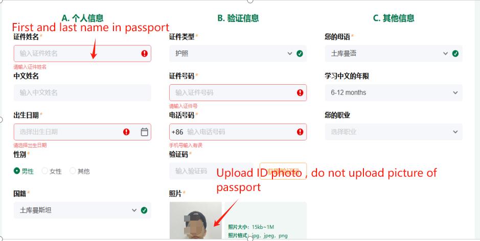 Fill in your personal information correctly, for ID Name, Please fill in the passport full name, And follow the correct example to upload photos