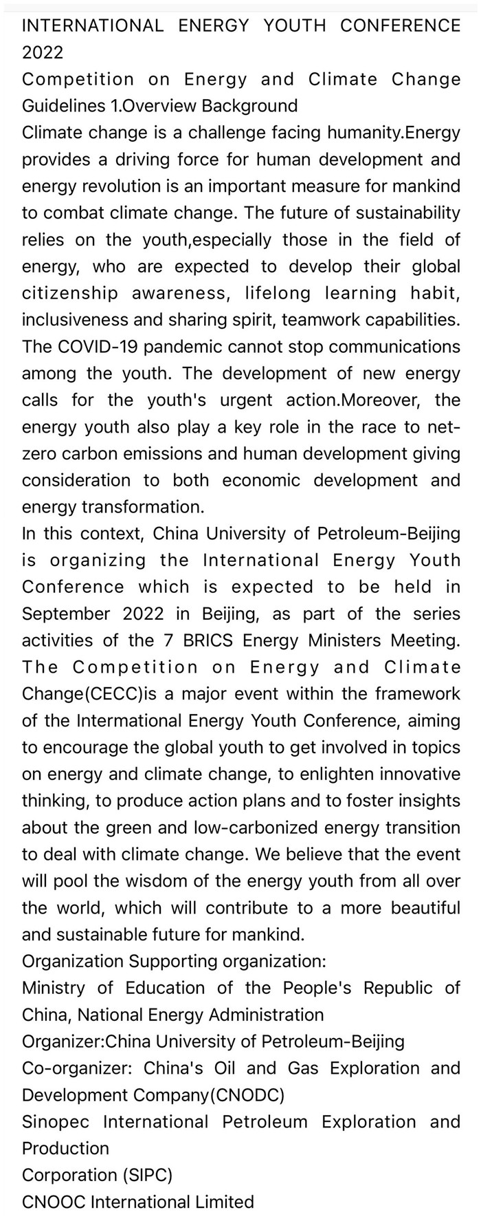 INTERNATIONAL ENERGY YOUTH CONFERENCE 2022 Competitionon Energyand Climate Change Guidelines