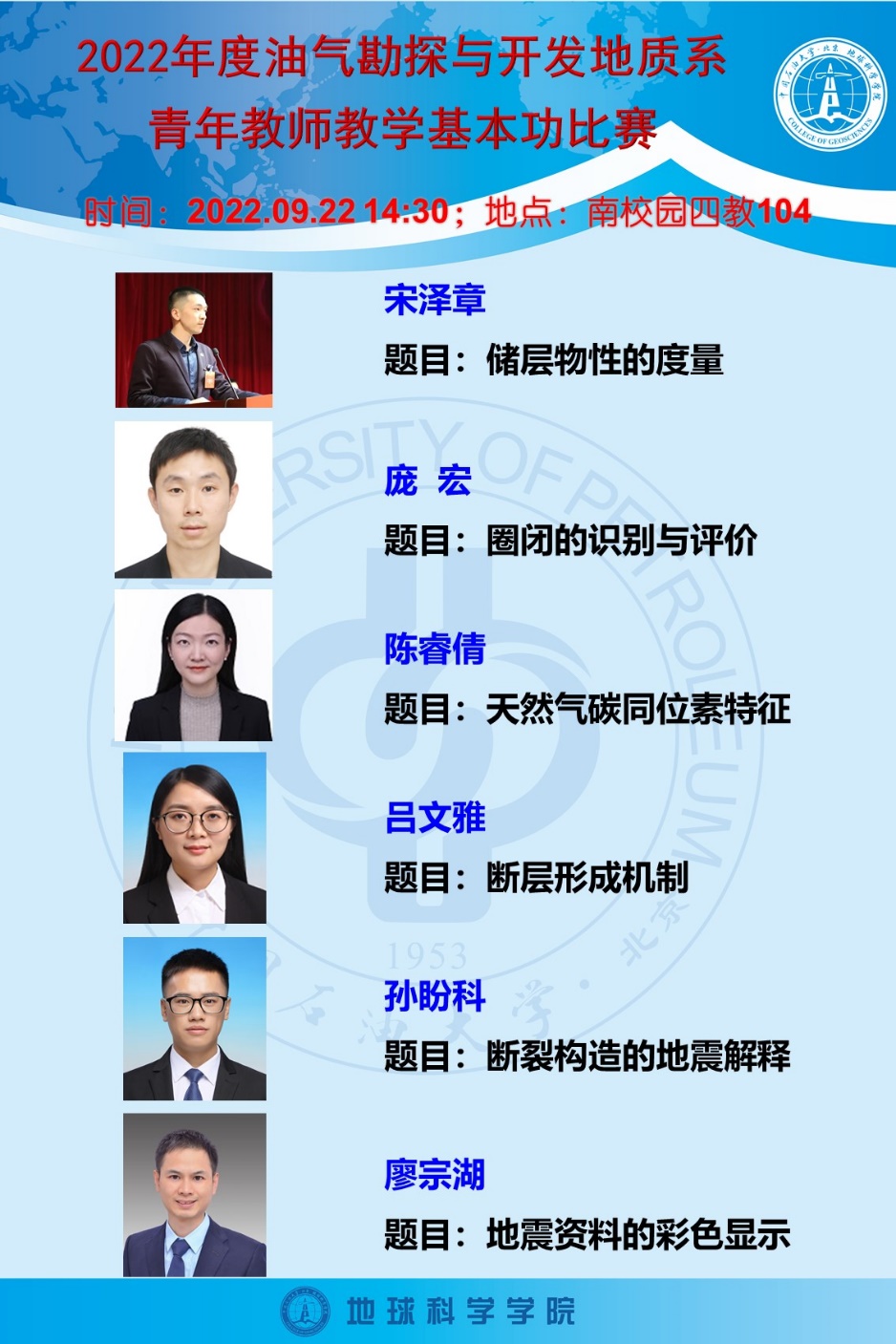 為了進(jìn)一步提高青年教師業(yè)務(wù)水平,促進(jìn)青年教師磨練教學(xué)內(nèi)功,夯實(shí)教學(xué)基本功,提升教學(xué)質(zhì)量,2022年9月22日下午,地球科學(xué)學(xué)院油氣勘探與開發(fā)地質(zhì)系舉辦青年教師教學(xué)基本功比賽。由我校“北京市教學(xué)名師”柳廣弟教授、吳勝和教授、岳大力教授,“北京市青年教學(xué)名師”陳冬霞教授擔(dān)任評(píng)委,我系6位青年教師參賽。