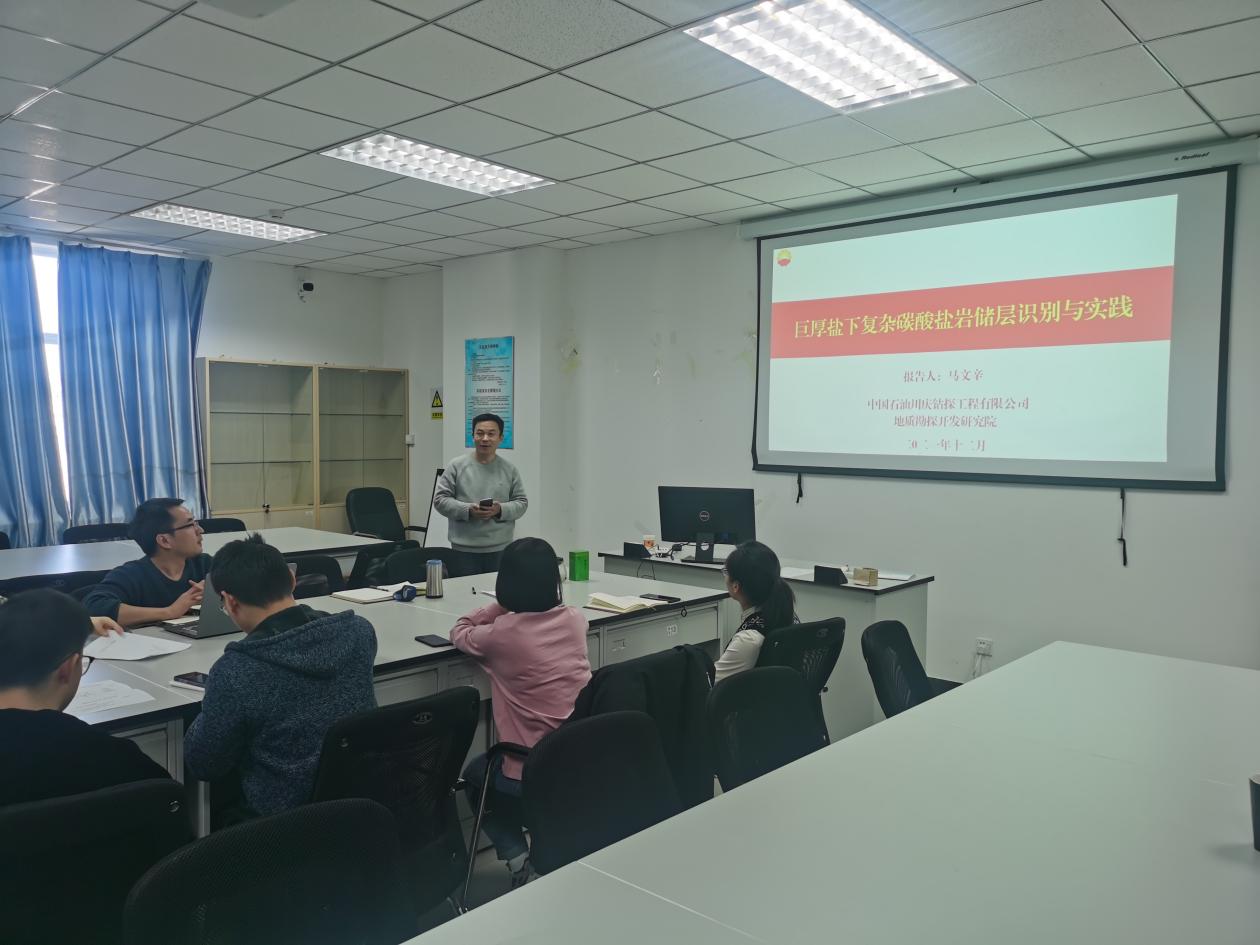 2021年12月2日下午,地球科學學院油氣勘探與開發地質系邀請中國石油川慶鉆探工程有限公司地質勘探開發研究院高級工程師馬文辛博士,在地質樓823開展了主題為“巨厚鹽下復雜碳酸鹽巖儲層識別與實踐”的學術報告,由劉成林教授主持,我校三十多位師生及數位中石油專家到場參加了本次學術沙龍。