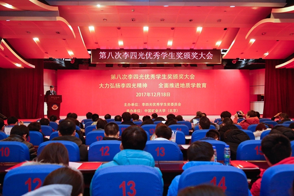 12月18日下午,第八次李四光優秀學生獎頒獎大會在中國礦業大學(北京)舉行。出席頒獎大會的嘉賓有國務院參事、國土資源部原總工程師、李四光地質科學獎基金會理事長張洪濤、原國土資源部科技與國際合作司司長姜建軍、原李四光地質科學獎委員會秘書長王澤九、教育部科學技術司司長雷朝滋、中國地質調查局原黨組成員、中國地質科學院原黨委書記、副院長、李四光地質科學獎委員會秘書長王小烈、中國工程院能源與礦業學部主任彭蘇萍院士、中國礦業大學(北京)校長楊仁樹、中國地質大學(北京)副校長劉大錳、中國石油大學(北京)副書記、副校長韓尚峰、北京大學教務部副部長劉建波、北京大學地球與空間科學學院名譽院長潘懋等。24位獲獎學生和900多名地質專業學生代表參加了頒獎大會。大會由中國礦業大學(北京)黨委副書記王忠強主持。