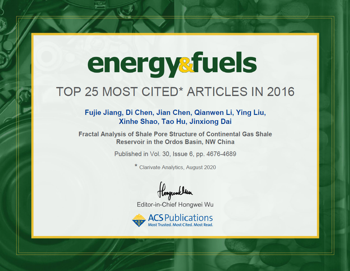 近日,我院姜福杰教授和陳迪博士研究生團隊榮獲著名期刊Energy & Fuels的卓越貢獻獎。該團隊于2015-2016年研究的陸相頁巖孔隙結(jié)構(gòu)分形特征,被國內(nèi)外研究學(xué)者多次引用,其中目前為止經(jīng)Web of Science統(tǒng)計的引用次數(shù)多達68次,2019年被評為ESI前1%高被引論文,2020年被Energy & Fuels期刊評為前25篇高被引論文之一。Energy & Fuels 期刊是美國化學(xué)協(xié)會旗下的著名期刊,主要研究領(lǐng)域包括能源與燃料、化學(xué)與工程、地球科學(xué)等。姜教授團隊將混沌數(shù)學(xué)中的分形理論應(yīng)用于頁巖孔隙結(jié)構(gòu)研究之中,并于2015-2016年通過物理實驗將陸相頁巖孔隙結(jié)構(gòu)分形維數(shù)分為兩類,并詳細分析了這兩類分形維數(shù)特征及影響因素,為陸相頁巖孔隙結(jié)構(gòu)理論研究做出了重大貢獻,促進了頁巖儲層定量評價技術(shù)的發(fā)展。